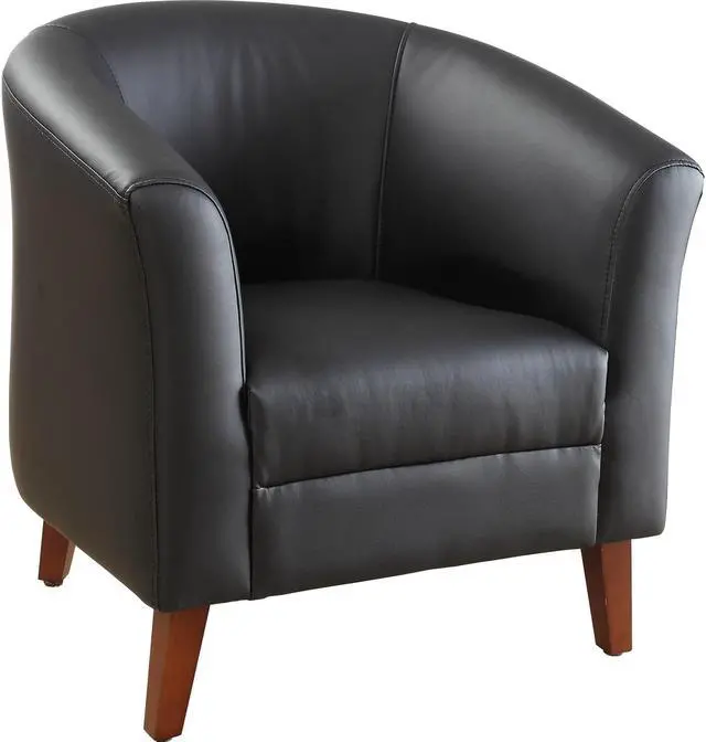 Add style and elegance to any reception or lounge area with this barrel armchair. It is upholstered with black bonded leather for a professional look. Classic design includes a supportive back, nearly full-height arms and a thickly cushioned seat. Four wooden legs hold up to 250 lb. capacity.