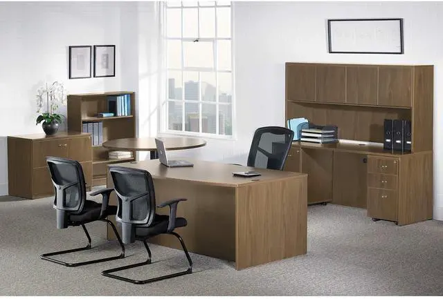 Office furniture offers a high-quality, Walnut laminate construction with metal-to-metal, cam-lock connections. Design includes 3mm PVC edges and adjustable floor guides for stabilization. Furniture has pre-drilled holes with metal inserts for easy attachment. Brackets are designed for L-shaped configurations and bridge returns.