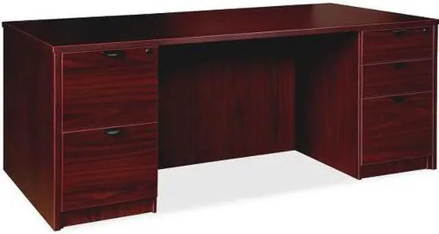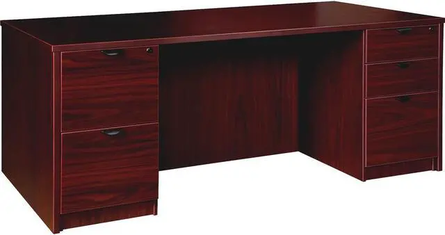 Double-pedestal desk is part of the elegant, Lorell Prominence 2.0 Series that is perfect for your executive office. Durable, Mahogany laminate surface is mar-resistant, burn-resistant and impact-resistant to withstand daily work life. The 1" thick top with matching 3mm edge banding is made with 45 lb. density particleboard and finished on both sides with high-performance, thermally fused melamine. Freestanding, 66" wide desk features a full modesty panel, two grommets in the top, and two 3/4 pedestals with locking drawers to secure files and supplies. One pedestal includes two file drawers while the other pedestal includes two box drawers for supplies and one file drawer for additional file space. File drawers hold letter-size or legal-size hanging files with included hangrails. Box and file drawers have 100 lb. full-suspension, ball-bearing slides. The 3/4" adjustable glides allow desk to remain level on uneven surfaces. Desk ships fully assembled so it's ready for immediate use.