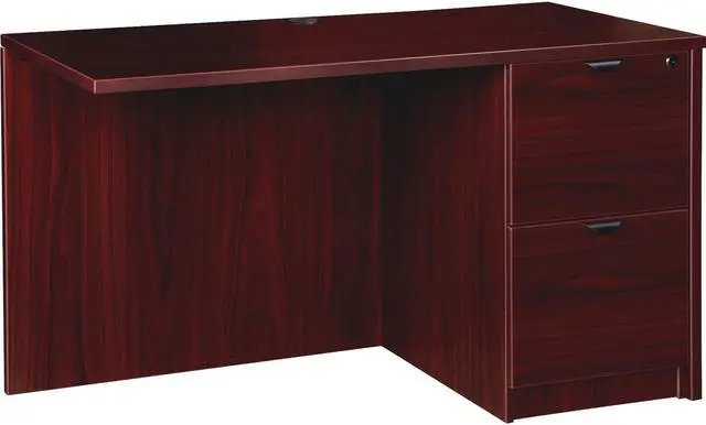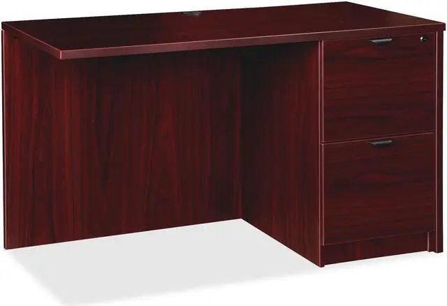 Right return is part of the elegant, Lorell Prominence 2.0 Series that is perfect for your executive office suites. It is not freestanding. Pair with left-pedestal desks or credenzas to create L-shaped and U-shaped configurations. Durable, Mahogany laminate surface is mar-resistant, burn-resistant and impact-resistant to withstand hectic, daily work life. The 1" thick top features matching 3mm edge banding. Return is made with 45 lb. density particleboard and finished on both sides with high-performance, thermally fused melamine. Return features a full modesty panel for privacy and a full pedestal with two locking file drawers to secure important files. File drawers hold letter-size or legal-size hanging files with included hangrails and have 100 lb. full-suspension, ball-bearing slides. The 3/4" adjustable glides allow return to remain level on uneven surfaces. Grommet in the top worksurface allows convenient cord management. Return ships fully assembled so it's ready for immediate use.
