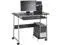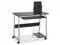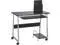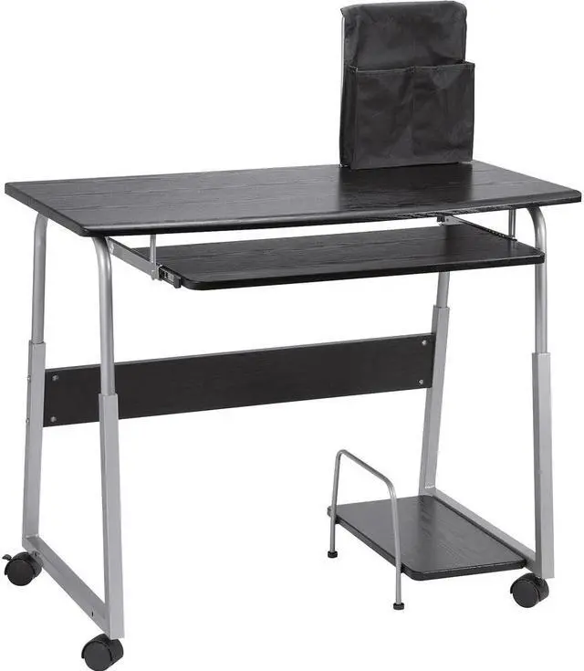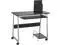 Mobile computer desk offers a compact design to fit in small spaces. Keyboard shelf semi-locks into place to prevent complete pull-out during use. Pullout keyboard shelf has a 15mm thick surface while the laminate top is 18mm thick. Desk holds up to 250 lb., evenly distributed, on its 1" square metal tube frame. Design also includes a CPU holder; medium-density fiberboard top; powder-coated metal legs with casters; four adjustable leveling glides on leg structure; and metal-to-metal screw fasteners.