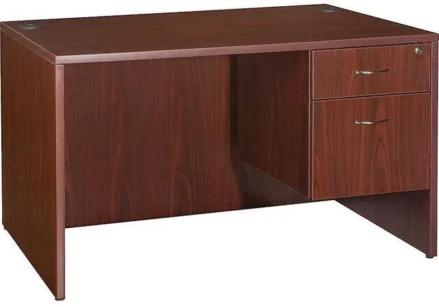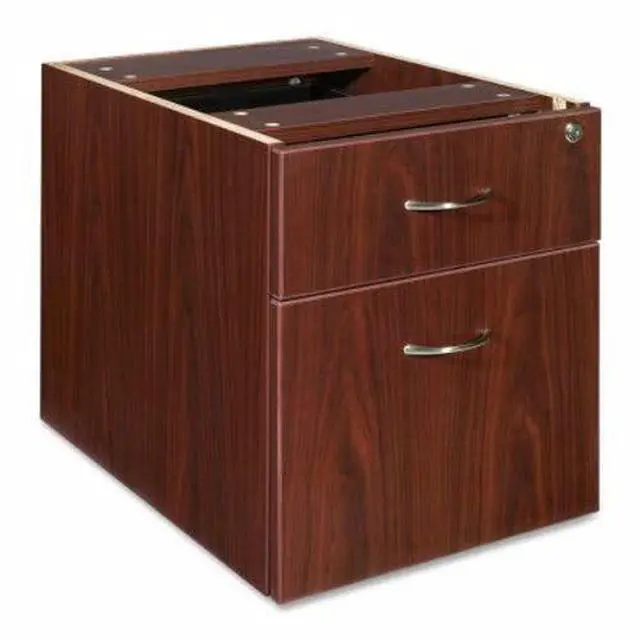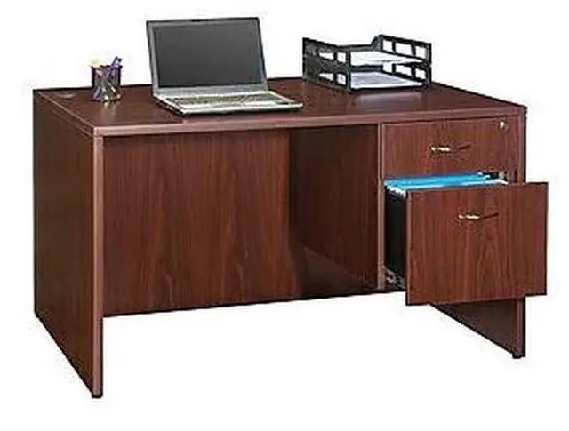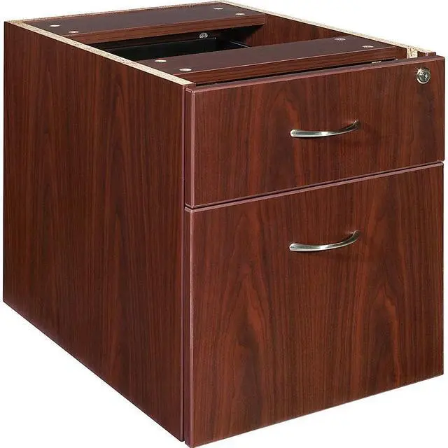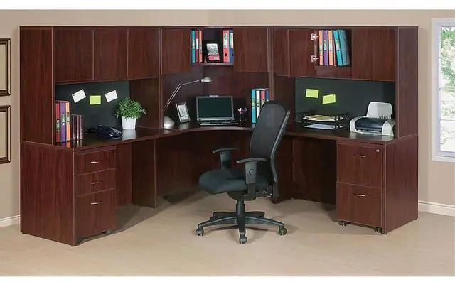 Office furniture offers a high-quality, Mahogany laminate construction with metal-to-metal, cam-lock connections. Design includes 3mm PVC edges and adjustable floor guides for stabilization. Furniture has pre-drilled holes with metal inserts for easy attachment. Brackets are designed for L-shaped configurations and bridge returns.