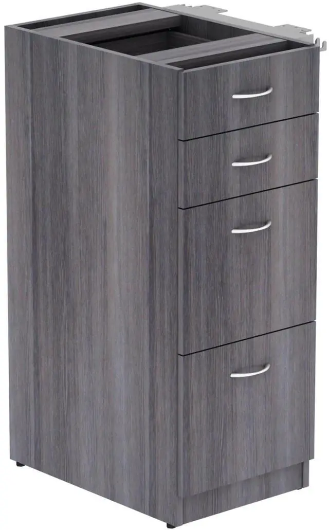 Four-drawer file cabinet is part of the Lorell Relevance Series, versatile and stylish office furniture that configures to meet your needs. Weathered Charcoal laminate exterior matches other units in the series for a cohesive, professional look. Cabinet with silver pulls includes two box drawers and two file drawers to maximize storage and filing space. It cannot be used freestanding and needs a worksurface to sit on the top. It is made with a side metal frame for durability. Adjustable leveling feet help keep the file cabinet even on uneven surfaces.