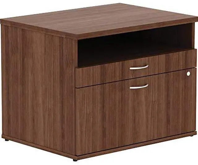 File cabinet credenza with open shelf is part of the Lorell Relevance Series, versatile and stylish office furniture that configures to meet your needs. Walnut laminate exterior matches other units in the series for a cohesive, professional look. Low cabinet with silver pulls includes an open shelf, one supply drawer and one lateral file drawer for versatile storage. Adjustable leveling feet help keep the credenza even on uneven surfaces.
