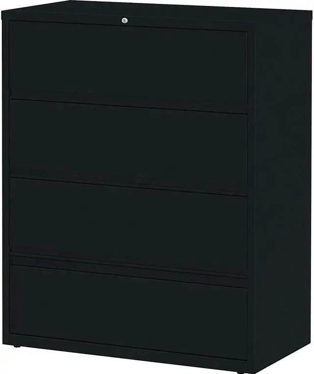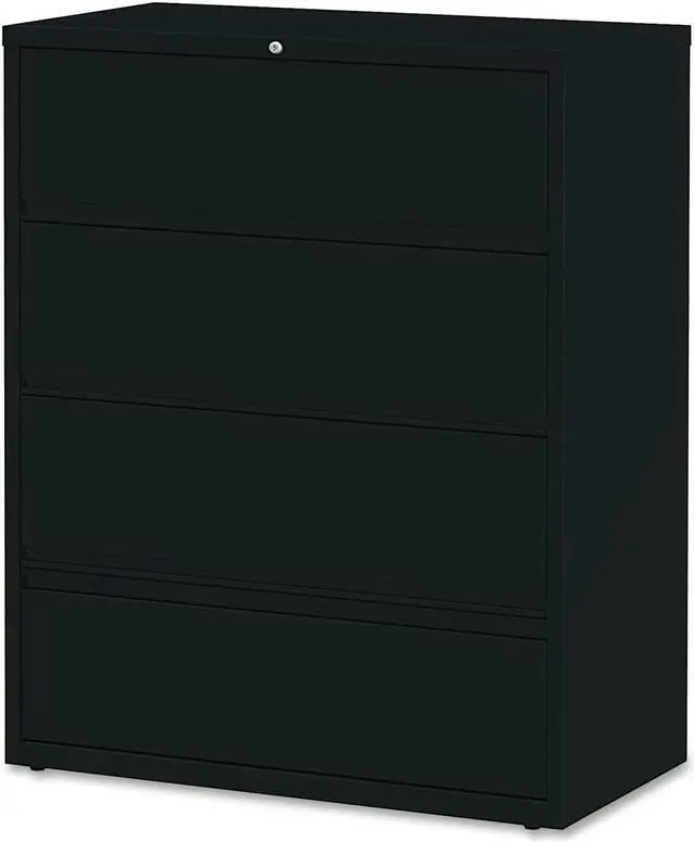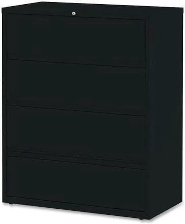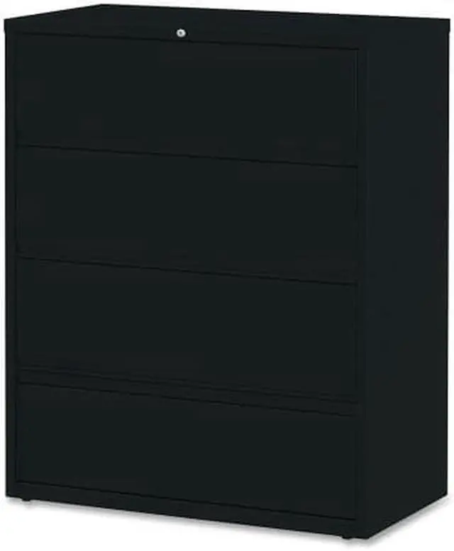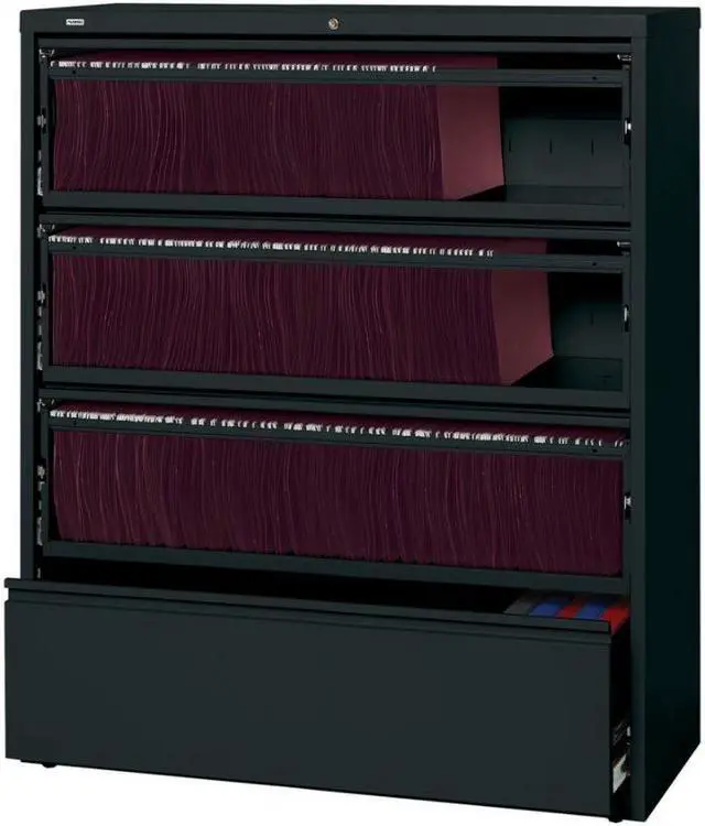 Receding lateral file with roll-out shelves offers a total of four drawers with heavy-duty, three-piece, ball-bearing slide suspension for smooth drawer movement. All drawers above the bottom one have receding fronts and roll-out shelves for easy access to your files. Bottom drawer has a fixed front. Included hangrails accommodate side-to-side filing of letter, legal or A4-size folders. Dual lock bars secure both ends of drawers. Interlock system prohibits the extension of more than one drawer at a time. 42" wide lateral file also features a core-removable lock; full-width designer drawer pulls; four adjustable leveling guides for stabilization and reinforced double-base construction.