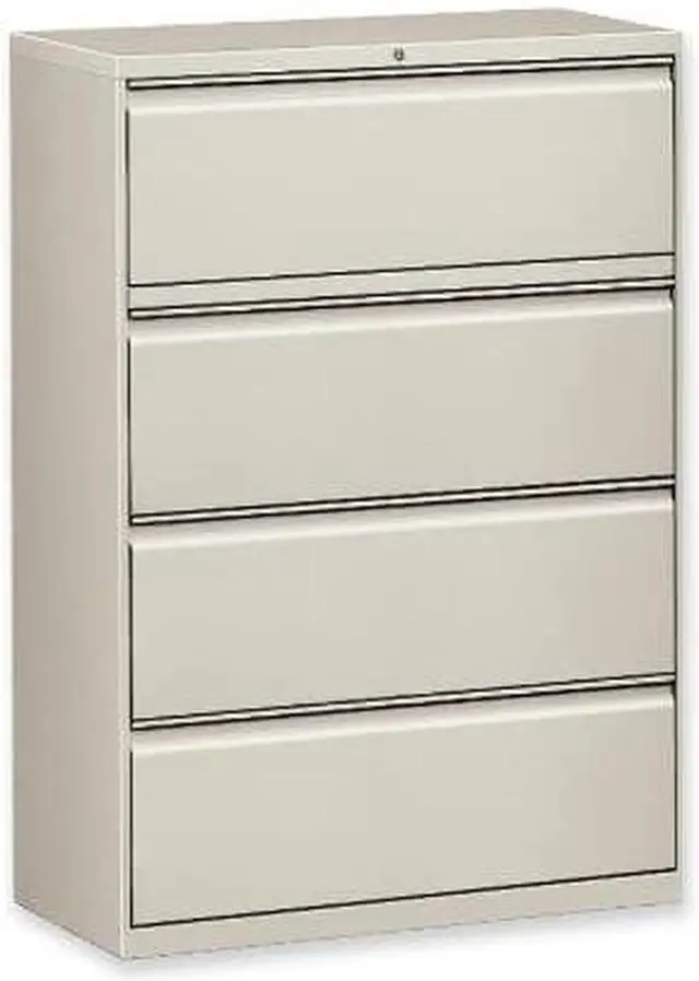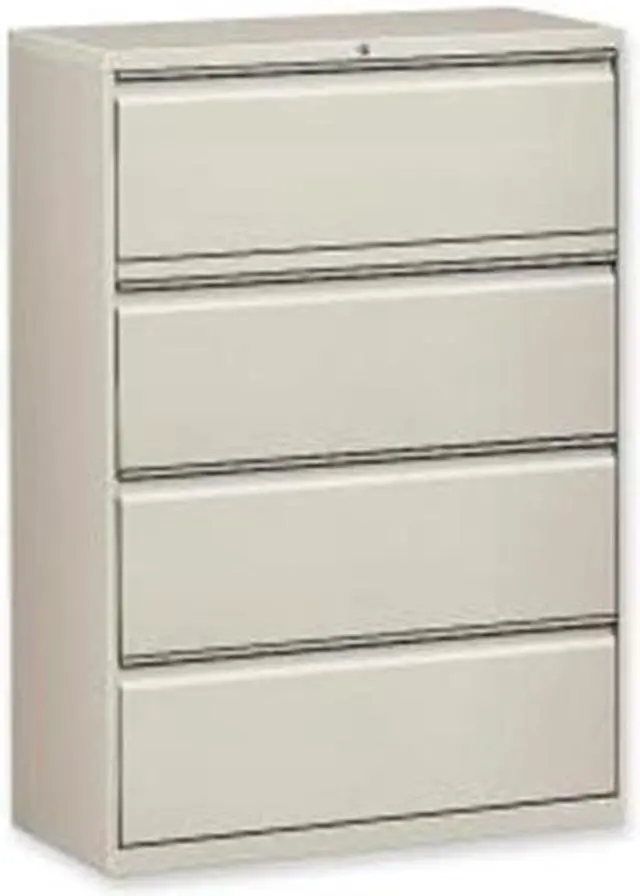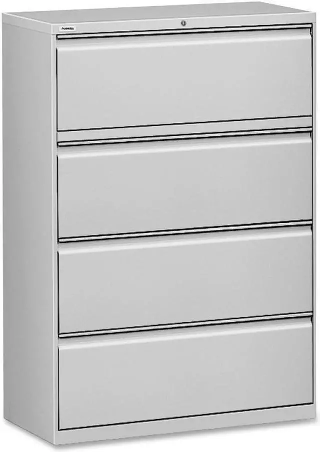42" wide lateral file features four versatile drawers with hanging file rails for side-to-side filing in letter-size, legal-size or A4-size. Each drawer has a magnetic label holder for easy identification where you need it. Design also features a core-removable lock for security, dual locking bars, full-width pull, ball-bearing slide suspension for smooth opening and closing, reinforced base, and four adjustable leveling guides for stabilization. Interlock system prohibits the extension of more than one drawer at a time for your safety. Counterweight prevents tipping. Lateral file meets or exceeds applicable ANSI/BIFMA standards.