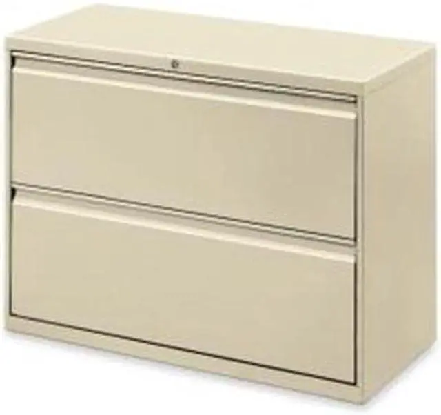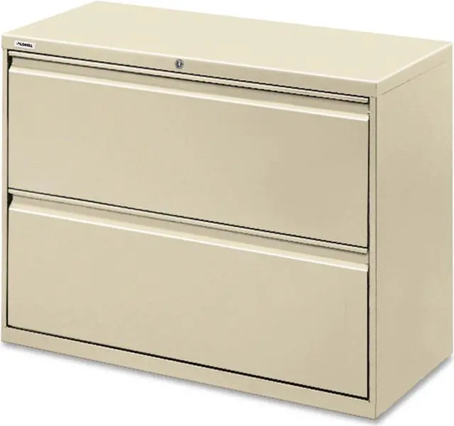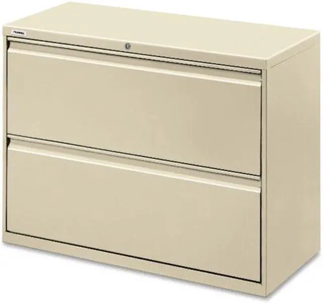 42" wide lateral file features two versatile drawers with hanging file rails for side-to-side filing in letter-size, legal-size or A4-size. Each drawer has a magnetic label holder for easy identification where you need it. Design also features a core-removable lock for security, dual locking bars, full-width pull, ball-bearing slide suspension for smooth opening and closing, reinforced base, and four adjustable leveling guides for stabilization. Interlock system prohibits the extension of more than one drawer at a time for your safety. Counterweight prevents tipping. Lateral file meets or exceeds applicable ANSI/BIFMA standards.