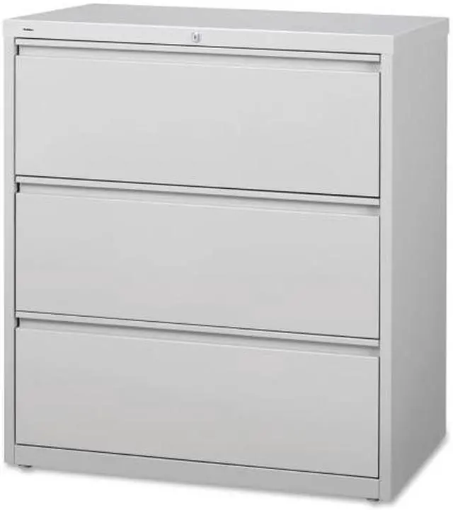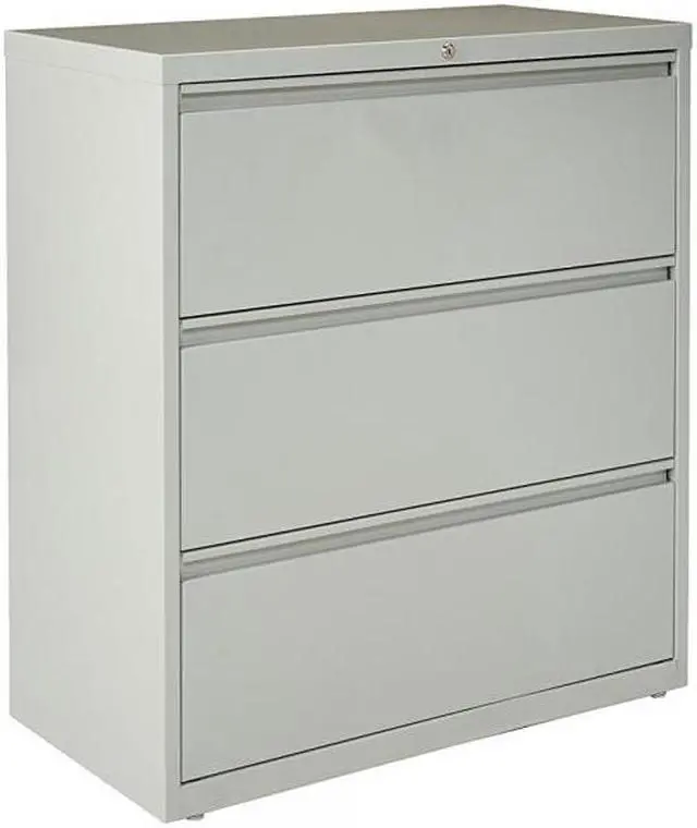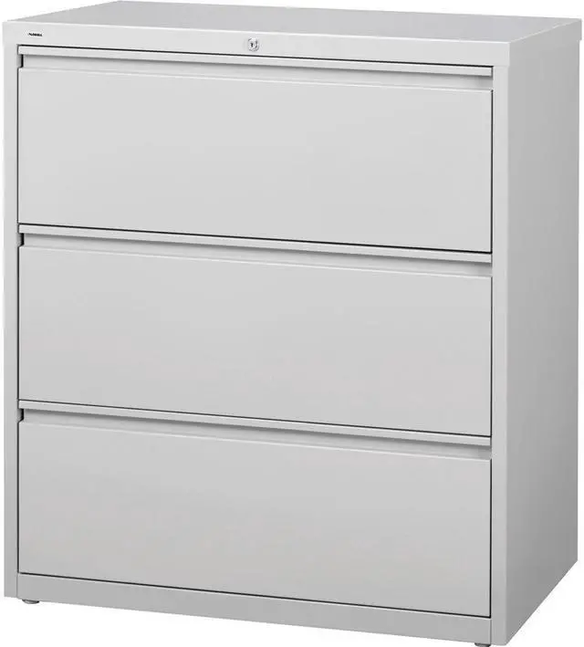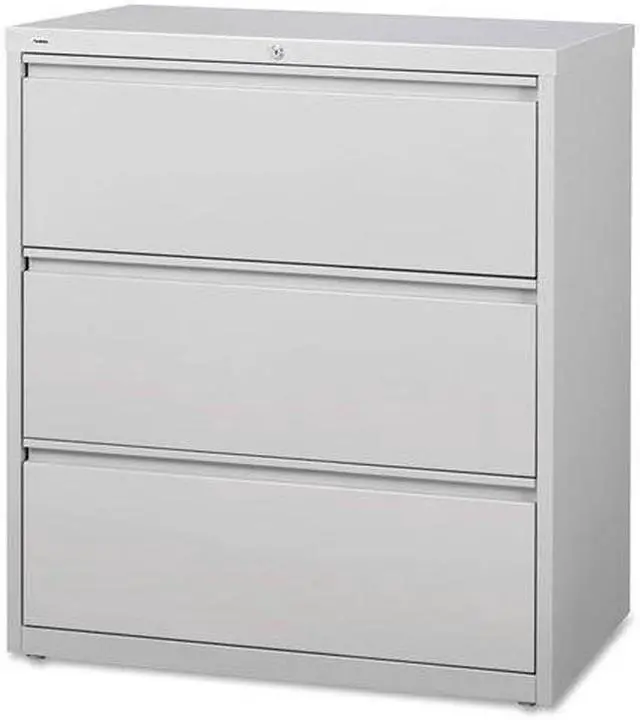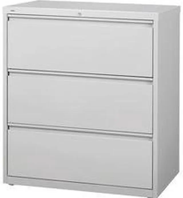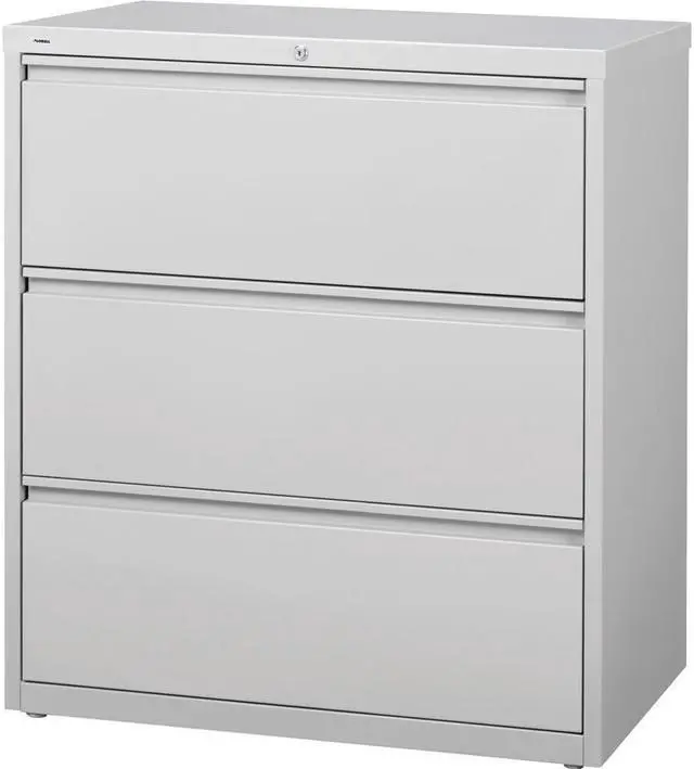 36" wide lateral file features three versatile drawers with hanging file rails for side-to-side filing in letter-size, legal-size or A4-size. Each drawer has a magnetic label holder for easy identification where you need it. Design also features a core-removable lock for security, dual locking bars, full-width pull, ball-bearing slide suspension for smooth opening and closing, reinforced base, and four adjustable leveling guides for stabilization. Interlock system prohibits the extension of more than one drawer at a time for your safety. Counterweight prevents tipping. Lateral file meets or exceeds applicable ANSI/BIFMA standards.
