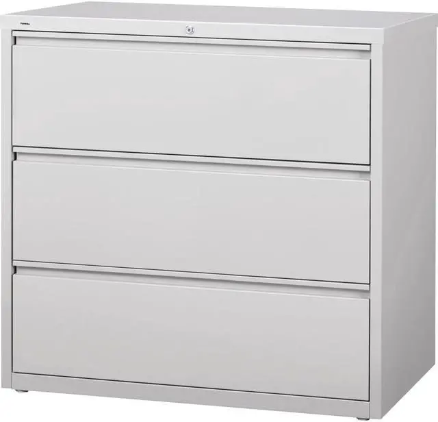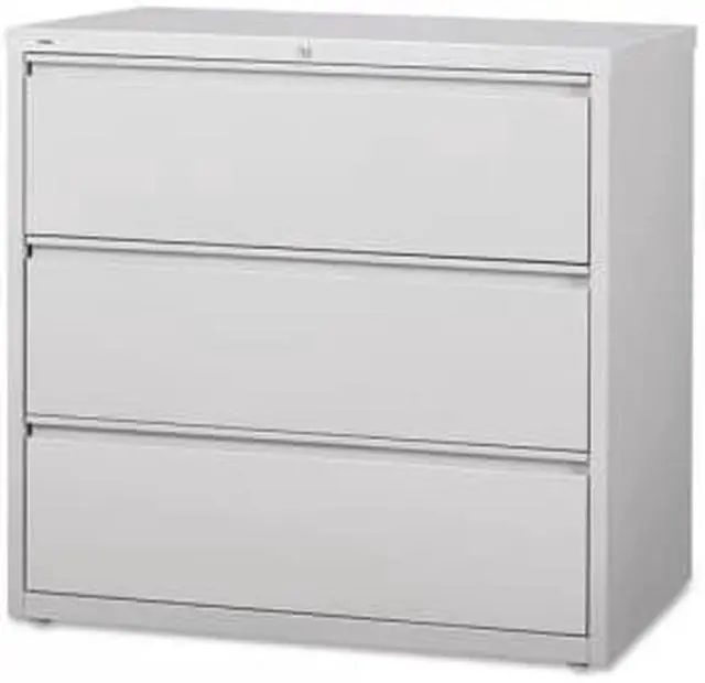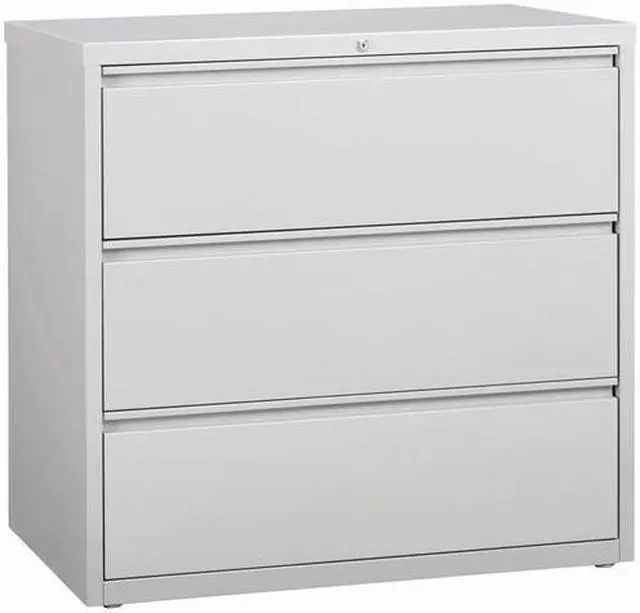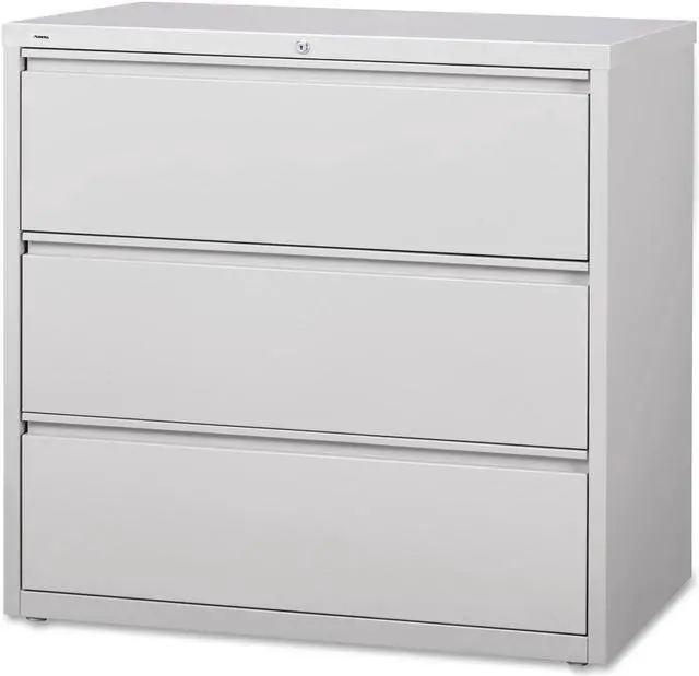 42" wide lateral file features three versatile drawers with hanging file rails for side-to-side filing in letter-size, legal-size or A4-size. Each drawer has a magnetic label holder for easy identification where you need it. Design also features a core-removable lock for security, dual locking bars, full-width pull, ball-bearing slide suspension for smooth opening and closing, reinforced base, and four adjustable leveling guides for stabilization. Interlock system prohibits the extension of more than one drawer at a time for your safety. Counterweight prevents tipping. Lateral file meets or exceeds applicable ANSI/BIFMA standards.