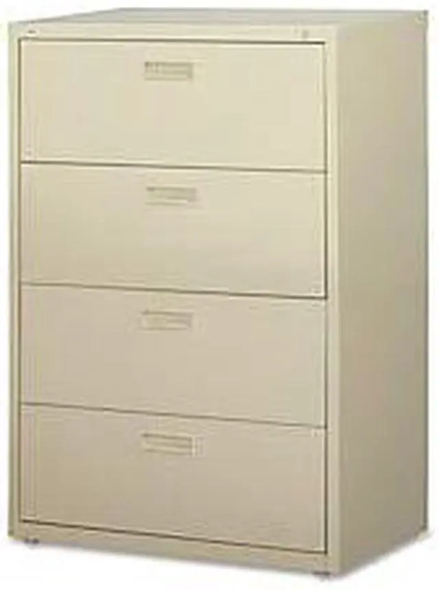 Four-drawer lateral file offers side-to-side filing for letter-size, legal-size or A4-size folders with the included hanging file rails to meet your filing needs. Interlock system prohibits the extension of more than one drawer at a time. Counterweight prevents tipping. Versatile file drawers offer three-part, steel ball-bearing, slide suspension. Commercial-grade lateral file is equipped with a core-removable lock for security, monochromatic drawer pulls, and two adjustable leveling guides for stabilization. Steel construction contains recycled material. Lateral file meets and/or exceeds applicable ANSI/BIFMA standards. More from the Manufacturer