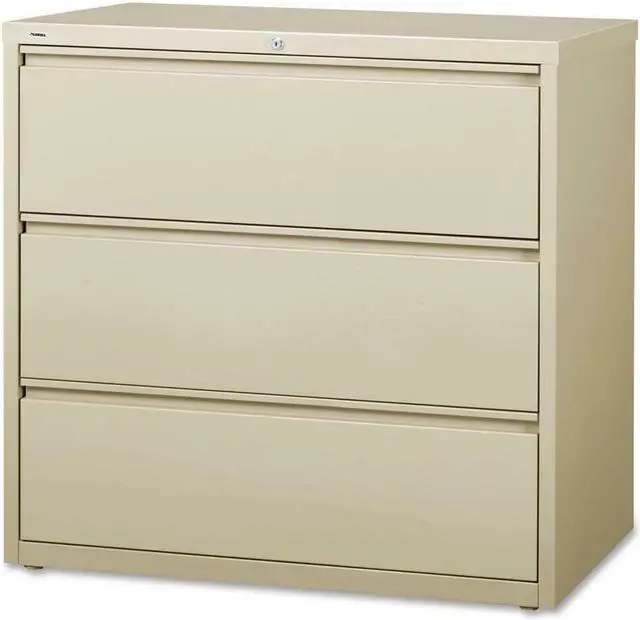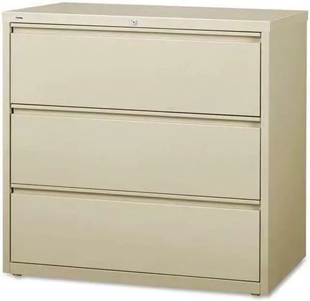 42" wide lateral file features three versatile drawers with hanging file rails for side-to-side filing in letter-size, legal-size or A4-size. Each drawer has a magnetic label holder for easy identification where you need it. Design also features a core-removable lock for security, dual locking bars, full-width pull, ball-bearing slide suspension for smooth opening and closing, reinforced base, and four adjustable leveling guides for stabilization. Interlock system prohibits the extension of more than one drawer at a time for your safety. Counterweight prevents tipping. Lateral file meets or exceeds applicable ANSI/BIFMA standards.