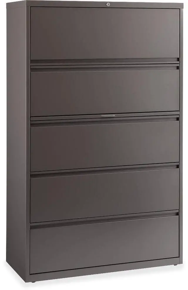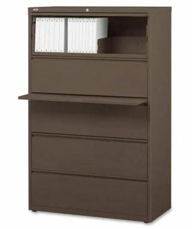 42" wide lateral file features a roll-out binder storage/posting shelf and four drawers with hanging file rails for side-to-side filing in letter-size, legal-size or A4-size. Each drawer has a magnetic label holder for easy identification where you need it. Design also features a core-removable lock for security; dual locking bars; full-width pull; ball-bearing slide suspension for smooth opening and closing; reinforced base; and four adjustable leveling guides for stabilization. Interlock system prohibits the extension of more than one drawer at a time for your safety. Counterweight prevents tipping. Lateral file meets or exceeds applicable ANSI/BIFMA standards.