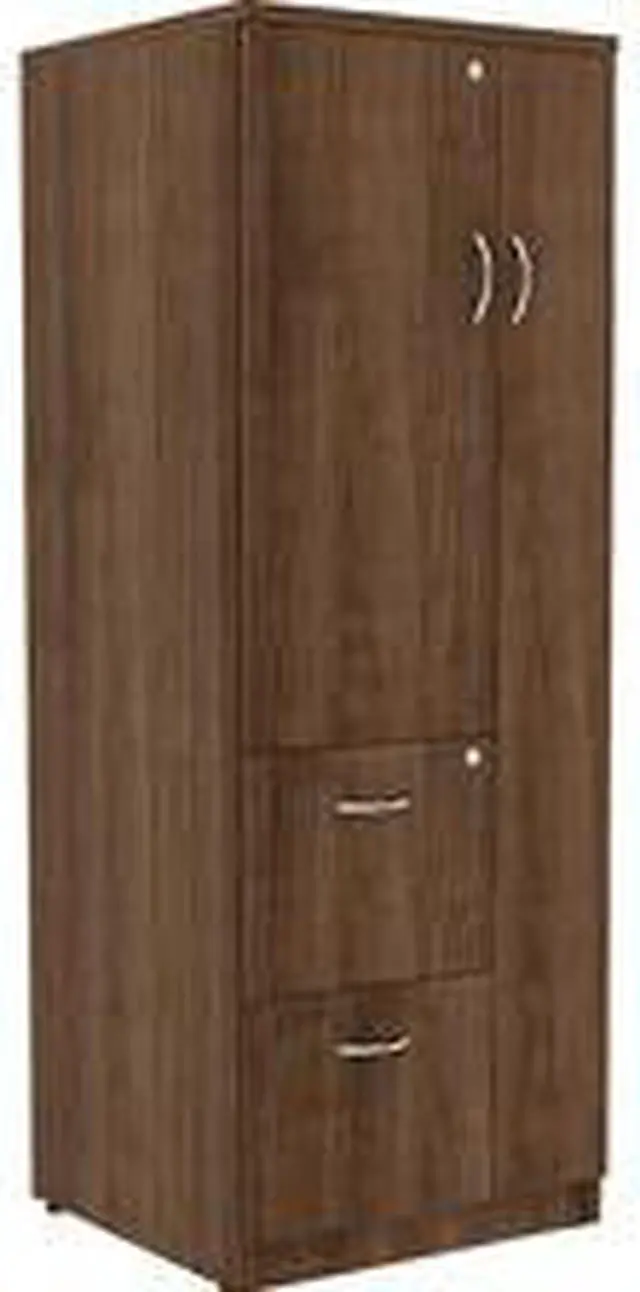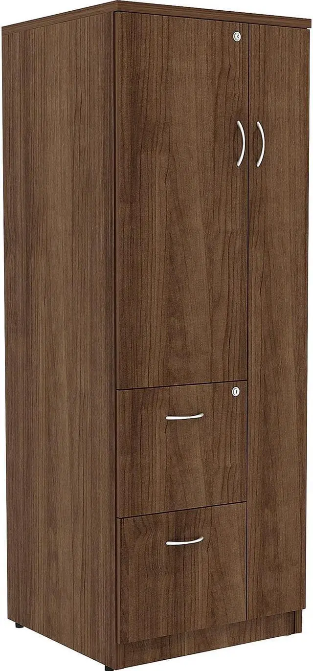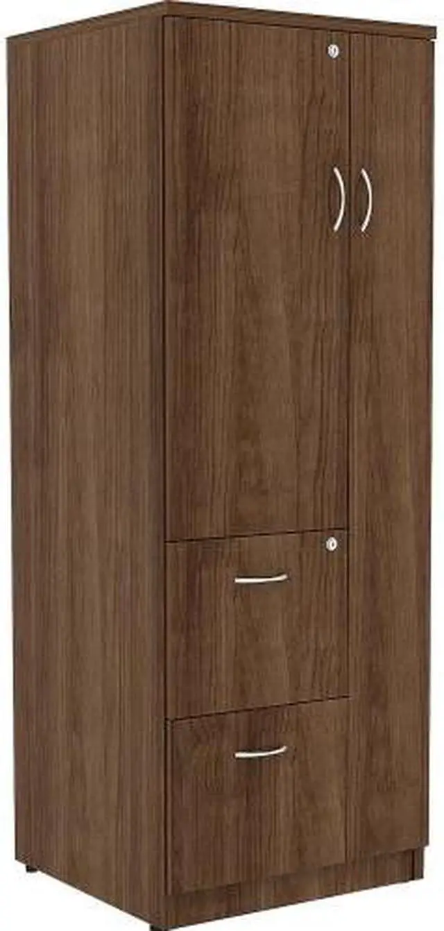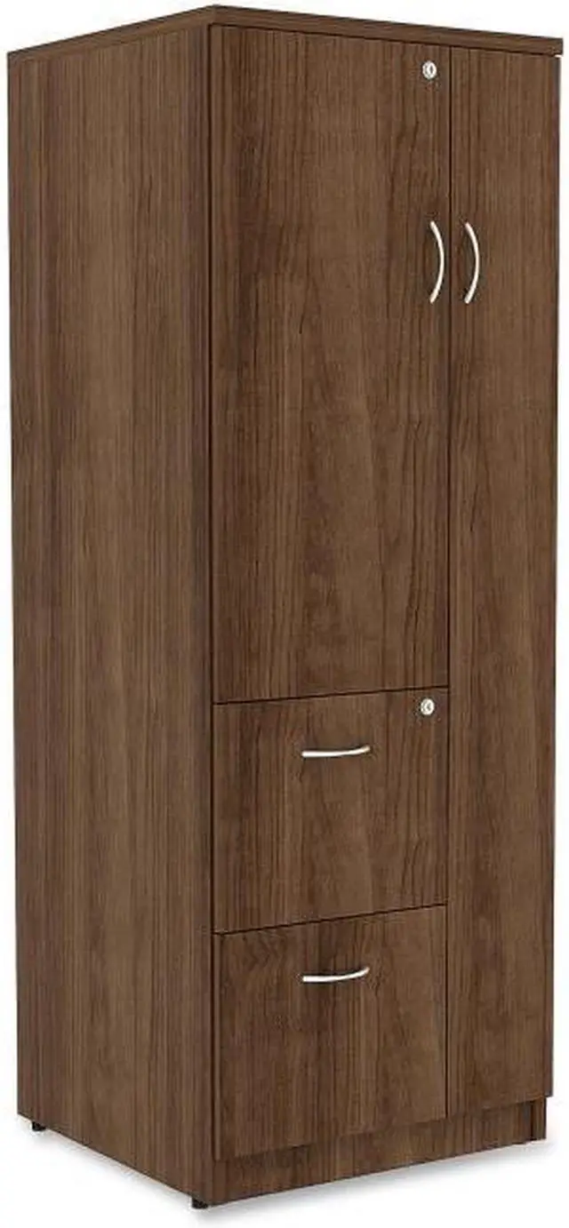 Tall storage cabinet is part of Lorell Essentials Series Laminate Furniture with high-quality laminate construction and metal-to-metal, cam-lock connections. Design of the cabinet expands your storage opportunities with the varied sizes of compartments. Full-length compartment on the right features a door to conceal contents. On the left, the half-length compartment includes a locking door and two shelves. The bottom two drawers lock to secure your belongings and hold letter-size files. Durable, Walnut laminate surfaces provide a professional look and are abrasion-resistant. The back is finished on both sides. Cabinet is made of particleboard and medium-density fiberboard. Adjustable levelers help stabilize the cabinet on uneven surfaces.