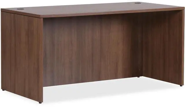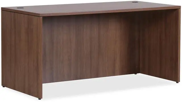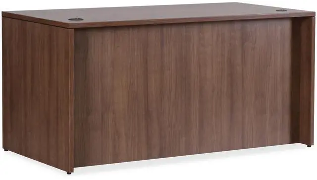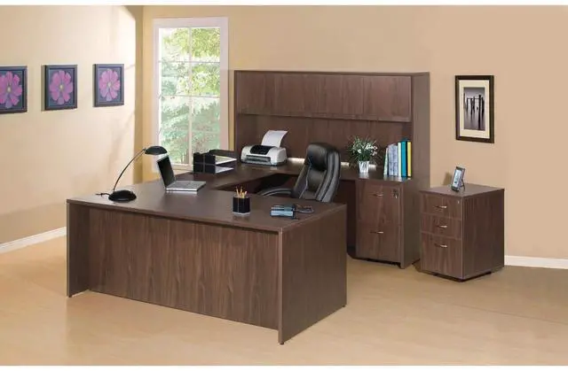 Office furniture offers a high-quality, Walnut laminate construction with metal-to-metal, cam-lock connections. Design includes 3mm PVC edges and adjustable floor guides for stabilization. Furniture has pre-drilled holes with metal inserts for easy attachment. Brackets are designed for L-shaped configurations and bridge returns.