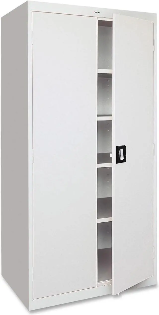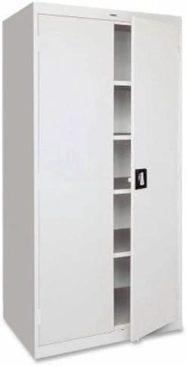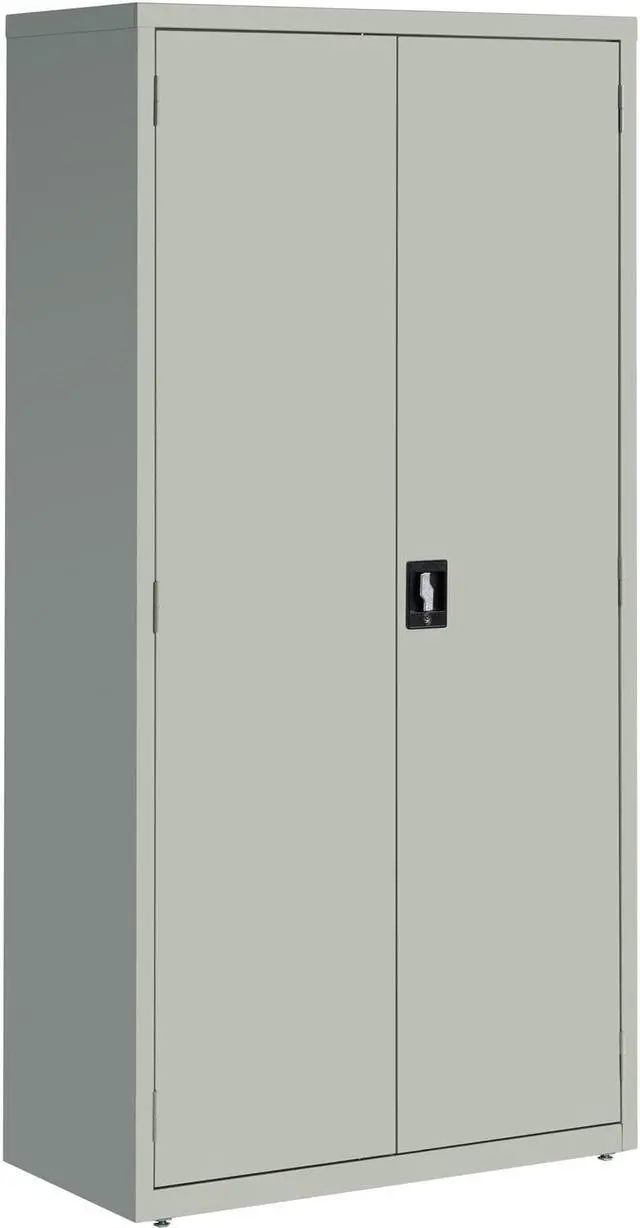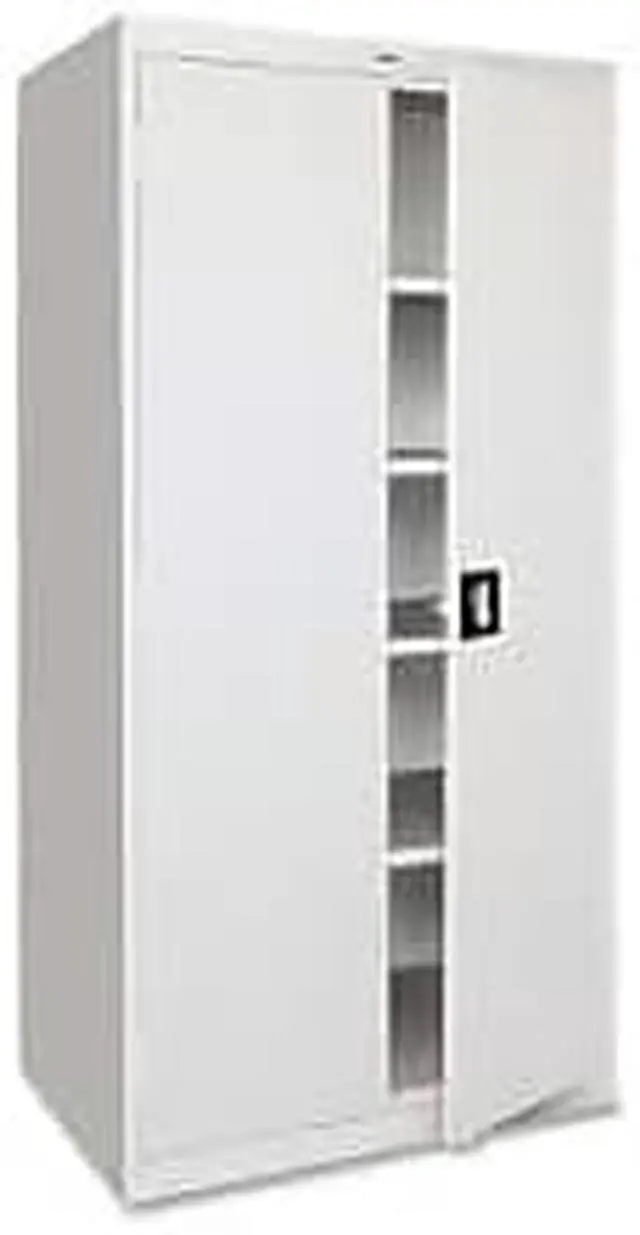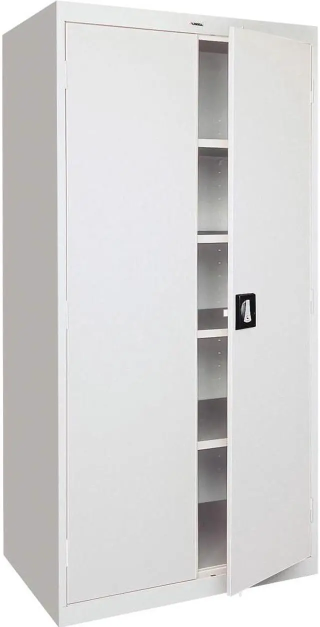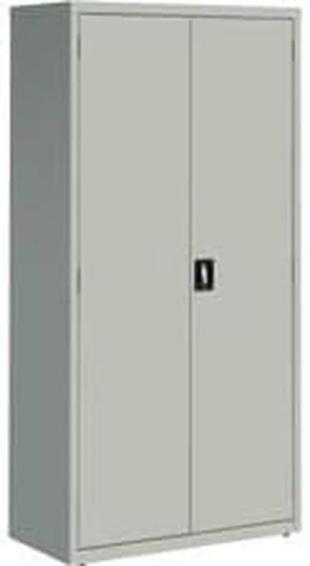 Storage cabinet offers a sturdy, private storage space for your office. Secure your belongings using the contemporary, three-point, recessed locking handle with keys. Durable cabinet is made of welded steel and holds 180 lb. per shelf, evenly distributed. Four shelves are fully adjustable in 2" increments. The bottom shelf is fixed. Welded steel construction has a powder-coat finish to make it last longer. 72" high cabinet also features three sets of hinges per door and meets or exceeds ANSI/BIFMA standards.