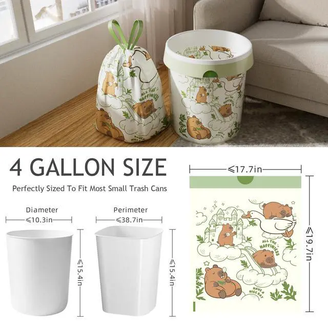 Small Size, Big Style Upgrade Your Space with Pretty & Practical Trash Bags!Say goodbye to boring, plain trash bags! The 4 Gallon Trash Bags with Drawstring bring a delightful splash of color and pattern to your everyday cleanup routine. Specifically designed for smaller spaces, these compact yet mighty bags offer the perfect blend of functionality and flair for bathrooms, home offices, craft rooms, or bedrooms.