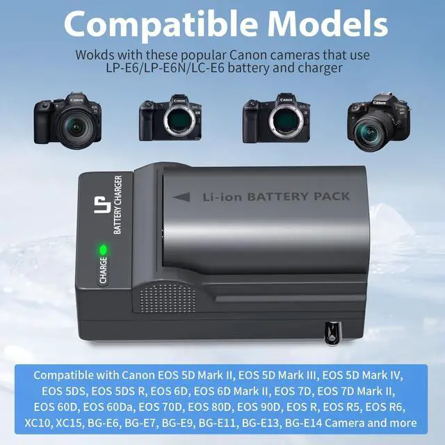 Widely Compatibility : LP-E6/E6N battery & charger is fully compatible with Canon EOS 5D Mark II, EOS 5D Mark III, EOS 5D Mark IV, EOS 5DS, EOS 5DS R, EOS 6D, EOS 6D Mark II, EOS 7D, EOS 7D Mark II, EOS 60D, EOS 60Da, EOS 70D, EOS 80D, EOS 90D, EOS R, EOS R5, EOS R6, XC10, XC15, BG-E6, BG-E7, BG-E9, BG-E11, BG-E13, BG-E14 Camera and more