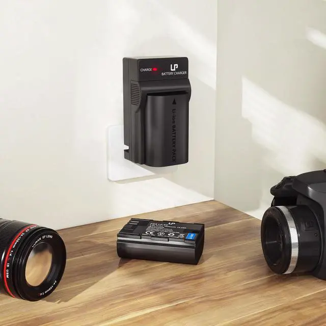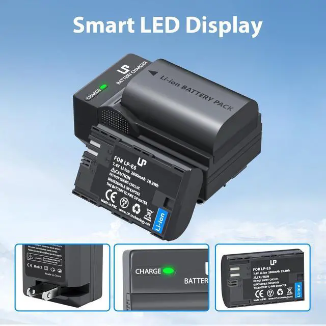 Intelligent LED Charger : This LP-E6/LC-E6 charger with built-in LED indicator shows the charging status of each battery intuitively. RED light means charging, GREEN light means full charge or no battery inserted