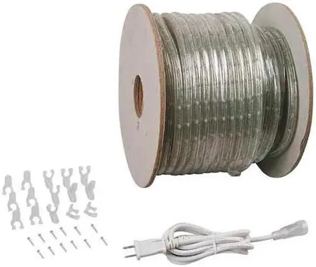 LED Rope Light, Casing Color Clear, Light Color White, Overall Length 150 ft, Overall Height 1/2 in, Wattage 108 W, Voltage 120 V AC, Rated Life 30,000 hr, Dimmable No, Cutting Intervals 3 ft, Includes (10) Splice Connectors, (100) Screws, (5) End Caps, (5) Extra Power Cords & End Connectors, (5) Spare Fuses, (50) Mounting Clips, Glue, Bulb Spacing 1 in, Casing Material PVC, Chasing No, Color Rendering Index 70, Color Temperature 5000K, Connection Type Plug-In