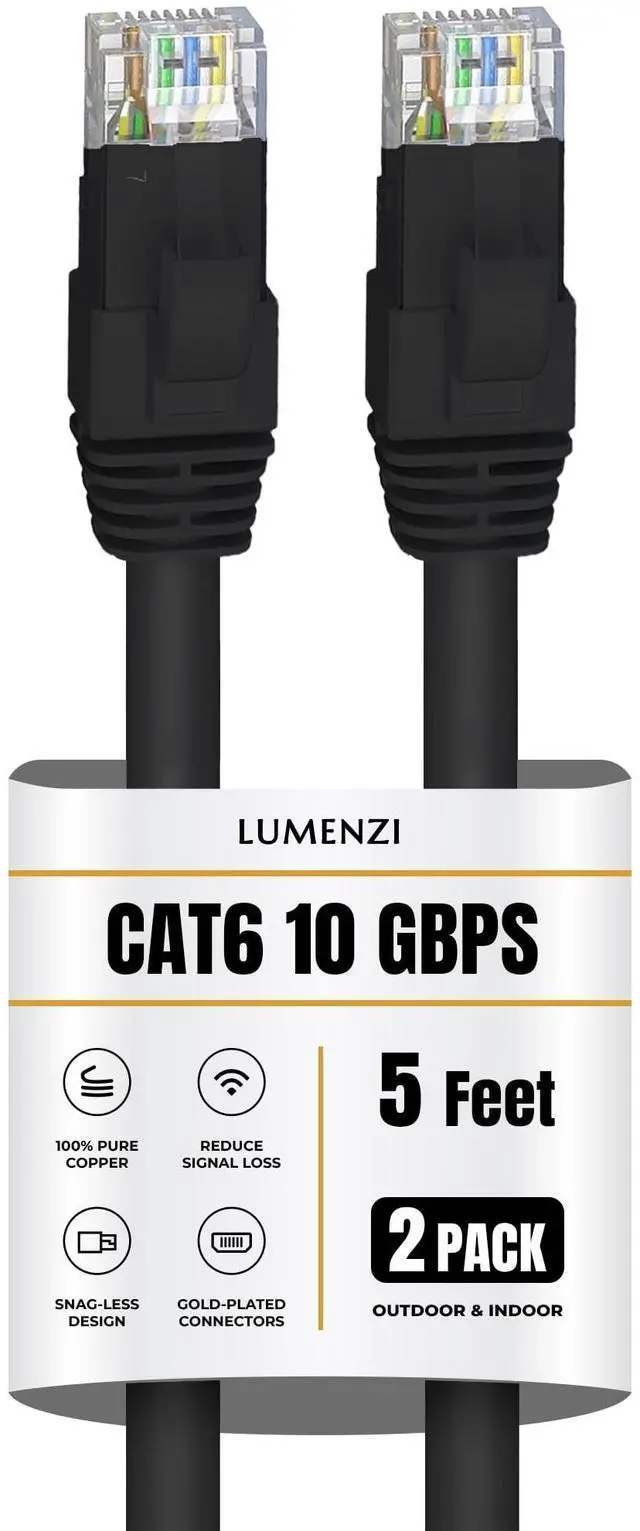 Lumenzi Cat 6 Ethernet Cable 5 FT in Black 2 Pack 10 Gbps Speed Network Round Rj45 Outdoor Indoor Direct Burial Bare Copper LAN Patch Cable for Router Gaming PS5 XBOX Printer Computer CCTV Switch