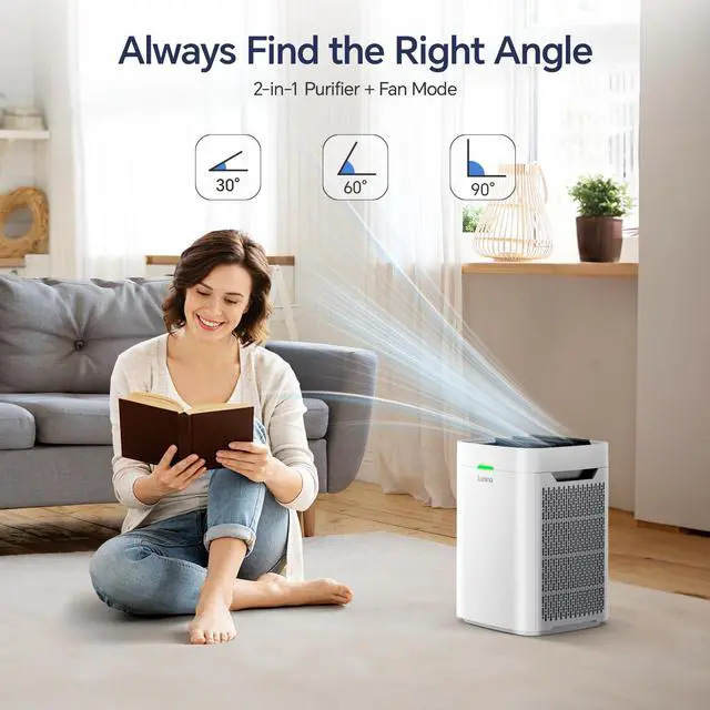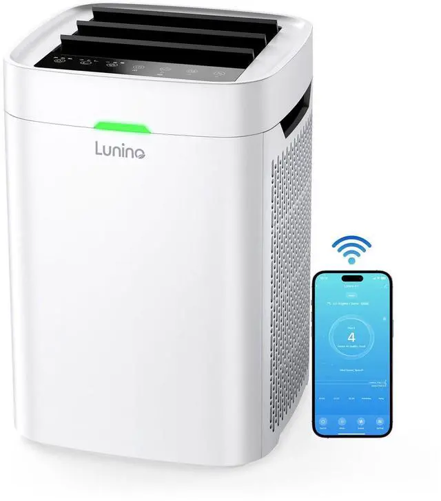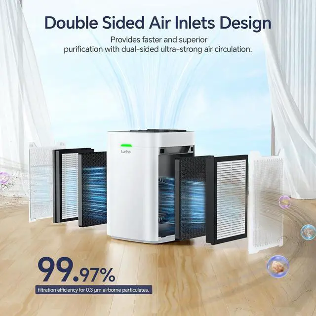 Double-sided Air Inlets Design & Compact yet PowerfulLUNINO air purifier features an innovative dual-side air intake design, purifying air simultaneously from both sides, resulting in a 40% faster purification speed compared to single-side intake models. Despite its compact size, this dual-filter air purifier boasts powerful purification capabilities. Suitable for large rooms up to 2400 ft² while consuming only 18W of power, ideal for living room, office, bedroom, dormitory, pet area, basement, kitchen, children's room.