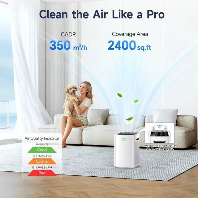 Air Purifiers for Home Large Room up to 2400 Ft², Double-Sided HEPA Air Purifier with Washable Pre-filter, Smart WiFi, PM 2.5 Air Quality Monitor, 3 Fan Modo, for Pets Hair, Dust, Pollen, Smoke