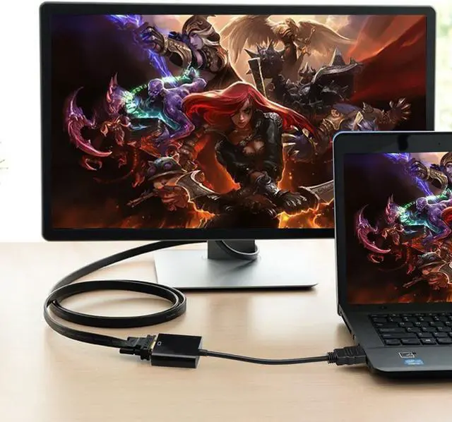 • The HDMI to VGA adapter provides a cost-effective and easy solution for connecting a desktop, laptop, or other devices with HDMI port to a VGA display such as monitor, projector or TV. Connect the HDMI male end of the converter to the HDMI port of your HDMI device, and connect the VGA female end to your VGA cable from the display.