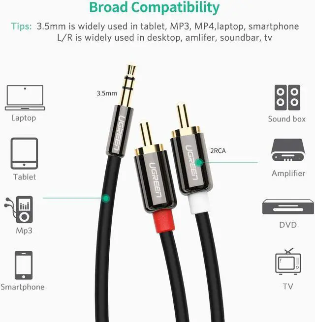 Broad Compatibility: This 3.5mm to 2RCA Audio Auxiliary Stereo Y Splitter Cable is compatible with iPhone, iPod, iPad, MP3 players, CD players, laptops, tablets and any other digital device with a 3.5mm audio jack; and home audio systems, like amplifier or receiver with RCA(white/left and red/right sockets)jacks.