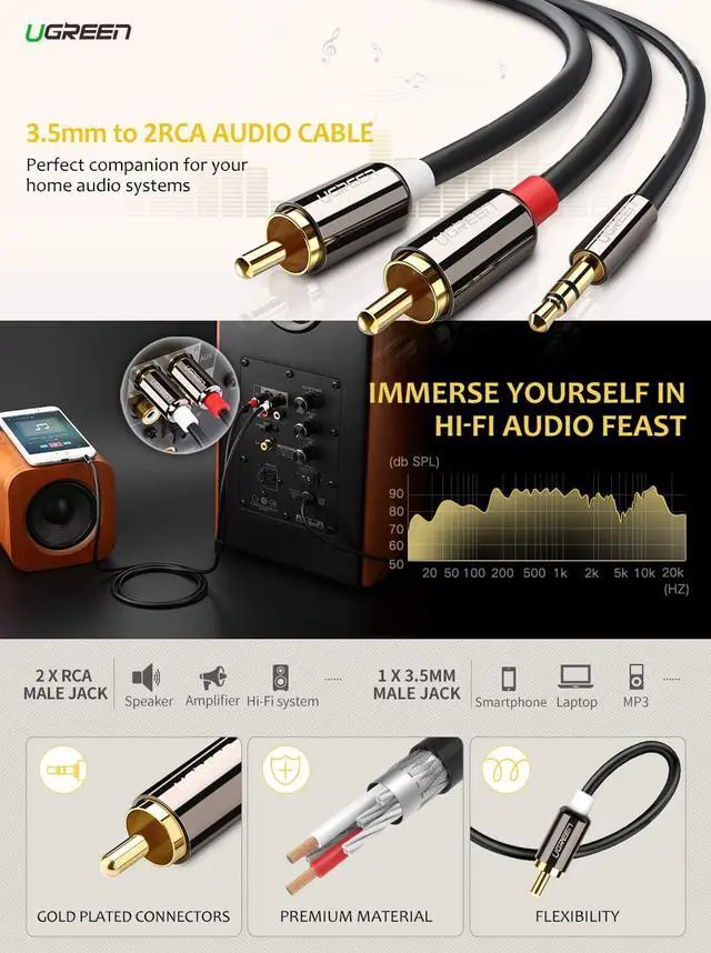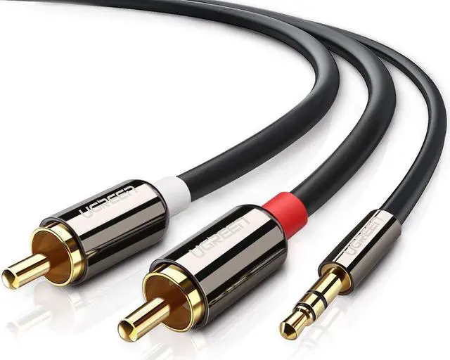 3.5mm(1/8" headphone plug) to 2 RCA(Right/Left) stereo patch cable is ideal for plugging the 3.5mm plug into the headphone jack of your device or computer and the 2 RCA's to the left and right auxiliary inputs on your sound system. This high-end 3.5mm to 2RCA stereo adapter cables offer incredible audio clarity over all lengths to provide a versatile connection between hardware for all your stereo audio needs.