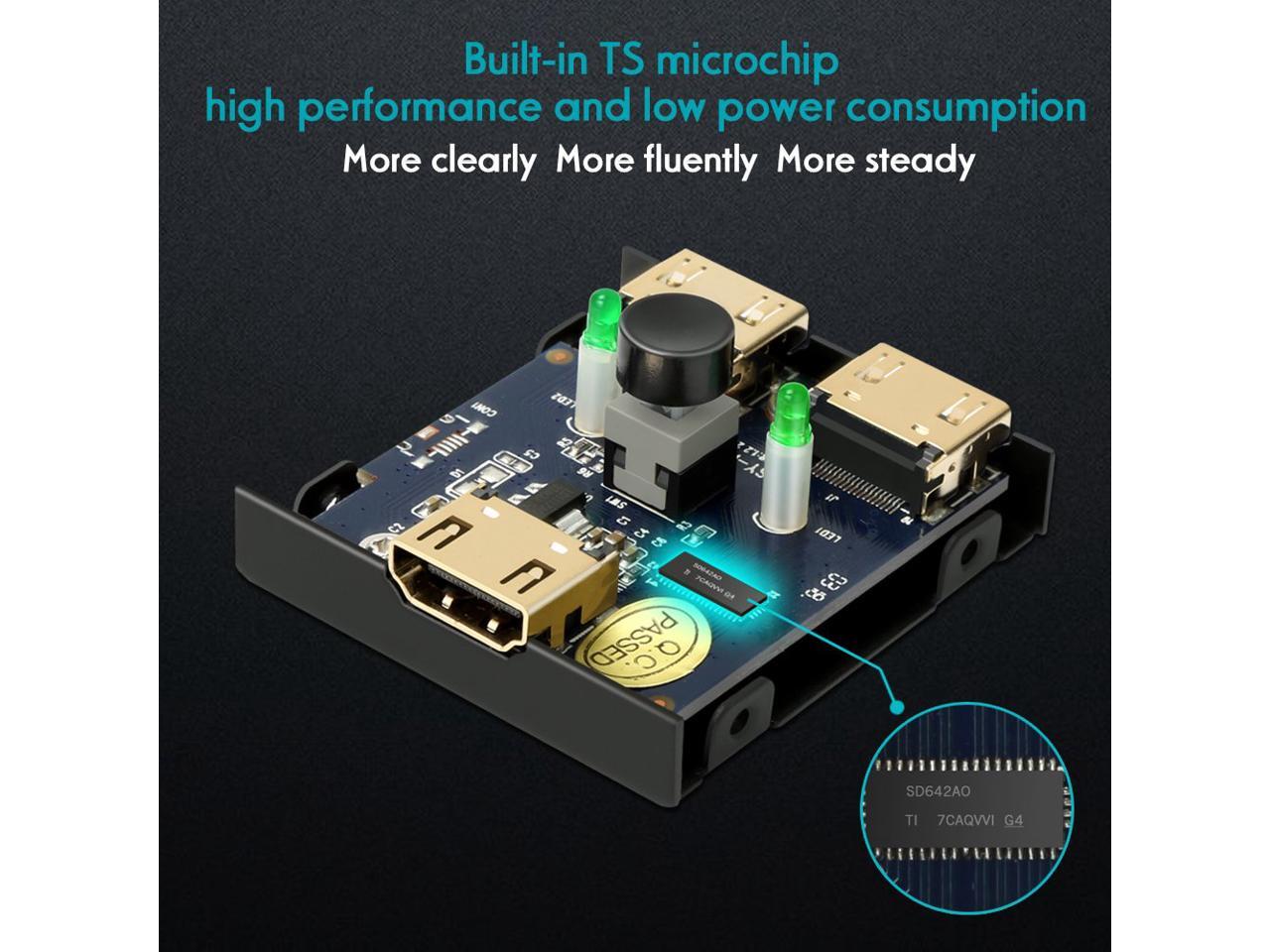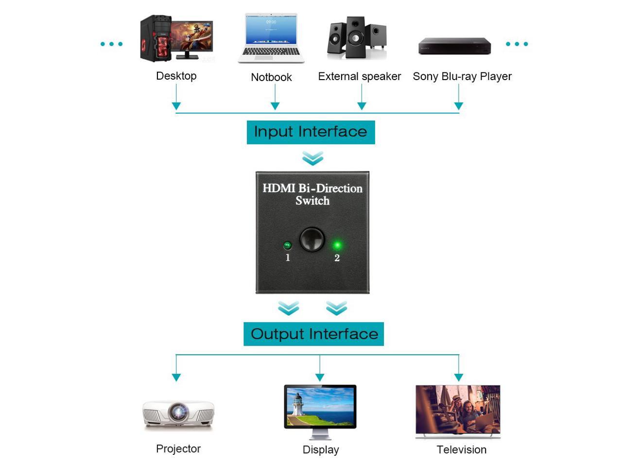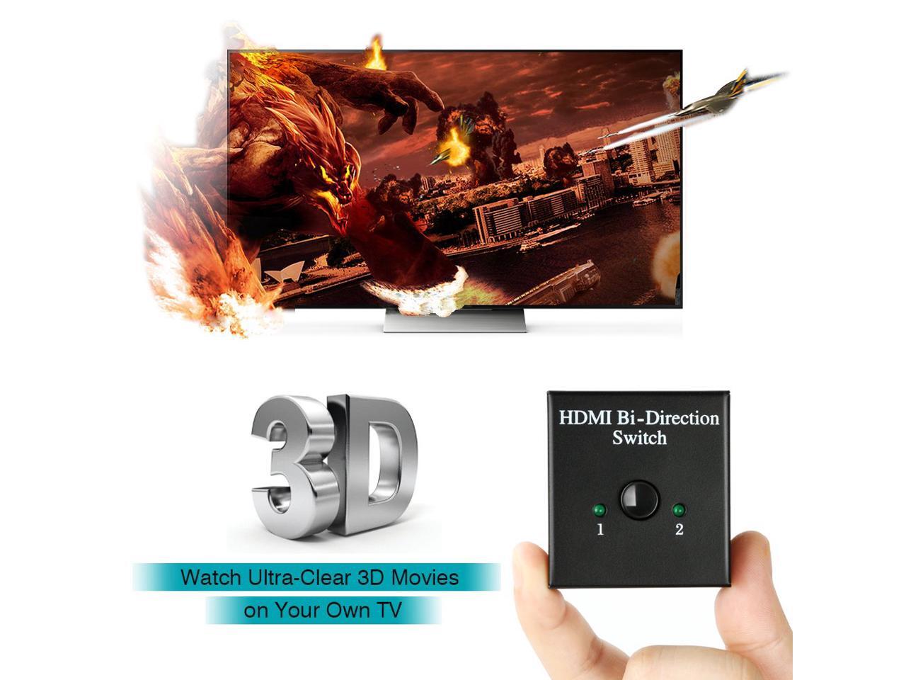 2 into 1 hdmi switch: Connect 2 HDMI sources to 1 monitor/TV/projector, switch 2 input sources via manual switch button.
