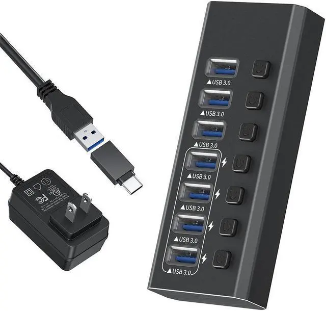 Say goodbye to inadequate ports. LUOM 7-port powered USB hub can expand 1 USB port to 7 external USB-A data ports for keyboard, mouse, camera and more, syncing data at blazing speeds up to 5Gbps. The charging ports of USB hub powered can provide up to 2.4Amps to charge your smartphone, tablet, etc