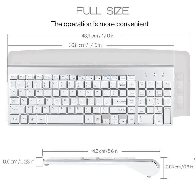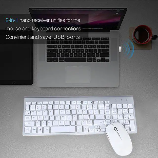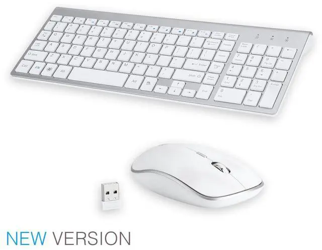 Features: Slim and Ergonomic Design: The slim keyboard has a tilt angle for the great typing position. Sweat-resistant, skin-friendly finish wireless mouse in contoured shape would provide hours of work comfortably. The full size keyboard type fast with numeric keypad and instant access your music, internet, e-mail, volume, etc by multi-media hot keys. (The hot-keys not fully compatible with Mac System) Less Noise&Profile Keys Typing: The keyboard's noise reduced keys and the silent click of the quiet mice will allow you to do your job without missing a sound or disturbing your environment. The wireless keyboard mouse combo features auto sleeping mode, plus on/off switches to help conserve battery use, you can go for months without the hassle of changing the batteries. (AA batteries are not included) Fast Operation 2.4G Wireless Plug and Play: Simply connect both your portable keyboard and mouse with one USB receiver(The nano receiver just snap in the storage of mouse near battery compartment. ) without any software and then enjoy a strong and reliable wireless connection up to 10 meters (33 ft) away with virtually no delays or dropouts. HIGH PRECITION: Wireless Mouse DPI 1600 in 3 levels- You can easily change the cursor sensitivity of this cordless mouse depending on your activities; usually 800 DPI for office, DPI 1200-1600 for 4K resolution monitor or entertainment like gaming at home. 2 polling rate: 125Hz and 250Hz; adjusted by pressing the right key and the wheel simultaneously at 3s for change. Compatible Wireless Keyboard and Mouse Combo: The keyboard and mouse combo includes a full-size keyboard and a high sensitivity mouse. Works with your PC, desktop computer, laptop or notebook. Compatible with Windows XP / Vista / 7 / 8 /10 operating systems. Warm Tip: Wireless receiver is stored in the receiver slot at the bottom of the keyboard; the keyboard need 2 x AAA battery and mouse need 1 x AA battery but NOT included. Why you choose this keyboard and mouse kit? Save Limited USB Ports Both keyboard and mouse are connected with the same USB receiver, thanks to the 2 in 1 design, limited USB ports wont trouble you any more. Quiet Adjustable DPI Mouse Quiet click, very nice and delicate and the high-definition optical sensor which gives you smooth tracking, accurate cursor control and effortless scrolling. Has 3 Mouse DPI Levels 800/1200/1600. 12 Multimedia Shortcuts 12 multimedia hot keys on the keyboard help you to play music and movie, browse the web, open email and more, extremely convenient and high efficiency. Silent Keyboard & Mouse Extremely reduce the click noise for a more pleasant experience. no matter you use on office, home or public area, it never make noise and affect others. Ultra Thin Keyboard & Mouse Both of the keyboard and mouse are ultra slim, the thinnest part of the keyboard is just 0.24 inch, the mouse is 1.2 inch. Very responsive keys in scissor-key-switches. Angled tilt provide support. Numeric Keypad & LED Indicator Only if you use the numbers, you will know how important to get a keyboard with attached number p