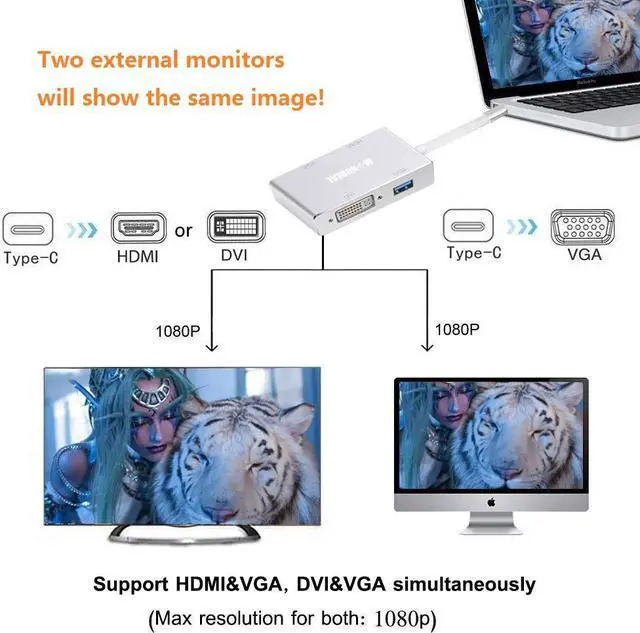 4 in 1USB-C (Type C) Adapter Converter: This USB3.1(Type-C) to HDMI VGA DVI Multiport Adapter with USB2.0 Hub for connecting PC/Laptop to HDMI/VGA/DVI-equipped monitors and displays.Plug and Play - no drivers or power adapters required.You can Share more realistic happiness & beauty with your friends/families.