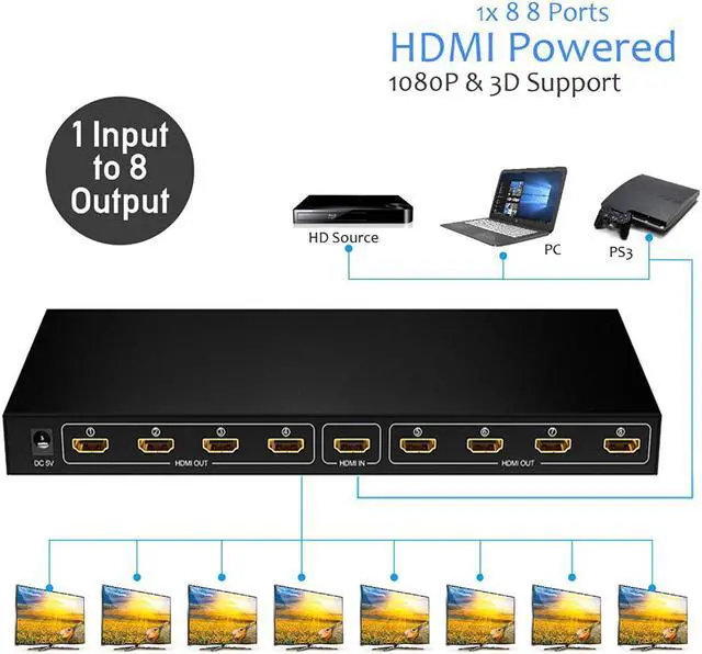 HDMI Splitter amplifies and distributes the HDMI input signal into eight identical, synchronized outputs. The splitter also has the ability of buffering and amplifying to achieve longer transmission distance of HDMI signal. Compatible with HDTVs, projectors, PC monitors, as well as various HDMI source devices including PC, cable/satellite receiver, Blu-ray DVD player, PS 3/4, Xbox, Chromecast, Amazon Fire TV etc., this splitter is suitable for home theater and other dual display applications such as data center control, information distribution, conference room presentation, school and corporate training environment. This reliable splitter will take any HDMI signal (rev 1.3 b) and duplicate the signal, sending the same high definition signal to 8 displays simultaneously.