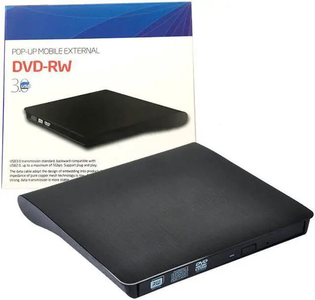 • It's annoying that our new laptop have no internal CD/DVD drive if we often need it to play or burn CDs or DVDs. Why not to get a portable USB external DVD RW drive to solve all the troubles immediately? Just plug it to your laptop with USB 3.0/2.0 port, press pop-up button and put disc, it will be recognzied then click to play it within minutes, no annoying setup and software installation.