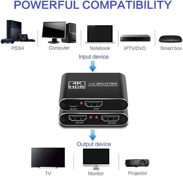 WIDE COMPATIBILITY: HDMI dual monitor splitter can suitable for most devices with standard HDMI interface. Input: Computer, X box, PS3/ PS4/ PS5, Fire Stick, Blu-Ray DVD Player, Satellite Receiver, Roku, PC etc. Output: HD TVs, Monitors, Projectors etc. Our dual monitor HDMI splitter will let you share the most luxurious video and audio, is an ideal for retail bar, office, backyard, living room.