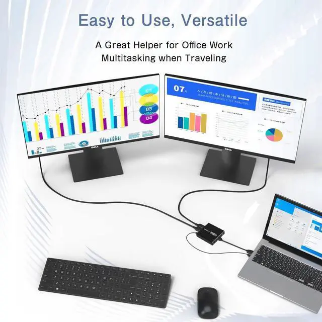 - MST/SST Mode: DP splitter supports AAA, ABB, ABC. Mirror mode shows same content on two monitors; extended mode displays different content for multitasking. Note: MST only supported by Windows. Mac/Linux only support mirror mode. MST reach up to 4K@120Hz