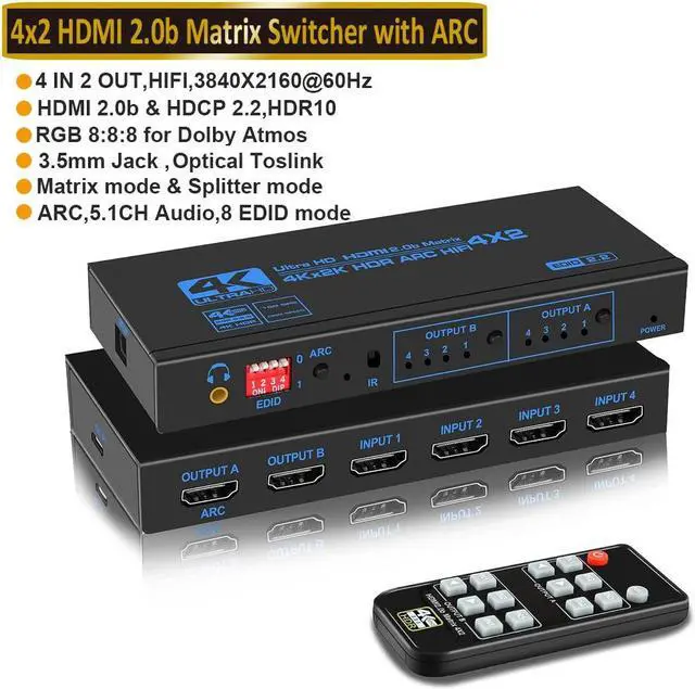Our 4K HDMI matrix switcher 4 in 2 out can extract the audio to Toslinks SPDIF optical audio output or 3.5mm stereo analog audio output separately at the same time. Also support LPCM 2.0/ 5.1, DTS, Dobly Digital and 16 smart EDID managements. Built-in automatic equalization and amplification to ensure optimum transmission without loss in video audio quality. (Only HDMI OUTPUT A port support ARC audio return channel function.)