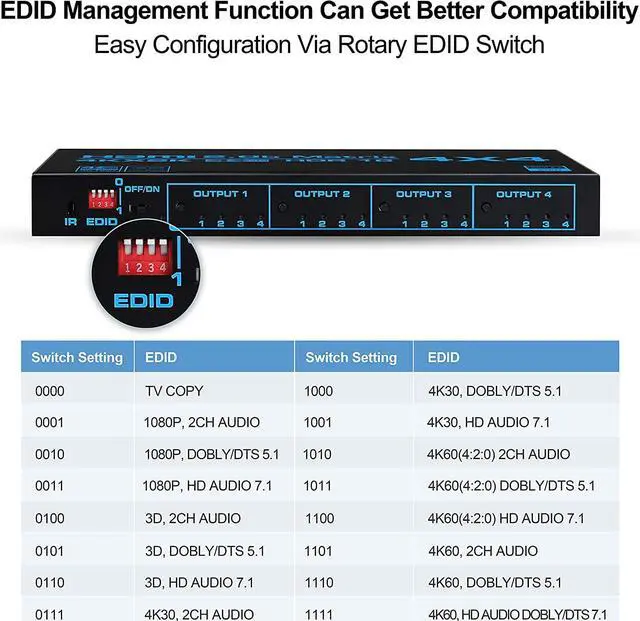 • 1.HDMI Matrix 4x4: This 4 in 4 Out HDMI Matrix Switch can connect 4 HD signal sources to 4 HD display terminals. The matrix allows4HDMI devices to be switched or split easily to 4 HDMI compatible monitors or projectors. It supports HDCP 2.2, HDMI2.0b, 4K@60HZ, RGB4:4:4, YUV 4:4:4, 4K HDR. This 4x4 HDMI Matrix Switch can also control by a IR remote control. After you had set the EDID, Please restart your HDMI Matrix Switch.