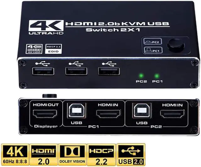 1.2 In 1 Out HDMI KVM Switch: 2 port KVM switch HDMI helps two computers share one set of keyboard, mouse and monitor, with 3 USB 2.0 USB ports, allow one button to switching. Easy to install, plug and play. Save your work space and time, easily and quickly switch between 2 computers, making work smarter and more convenient.