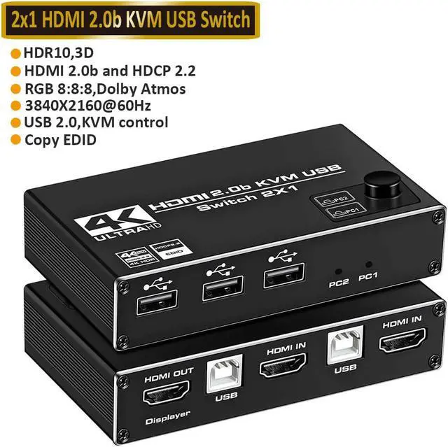 1.2 In 1 Out HDMI KVM Switch: 2 port KVM switch HDMI helps two computers share one set of keyboard, mouse and monitor, with 3 USB 2.0 USB ports, allow one button to switching. Easy to install, plug and play. Save your work space and time, easily and quickly switch between 2 computers, making work smarter and more convenient.