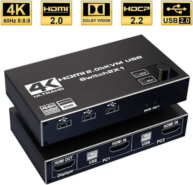 1.2 In 1 Out HDMI KVM Switch: 2 port KVM switch HDMI helps two computers share one set of keyboard, mouse and monitor, with 3 USB 2.0 USB ports, allow one button to switching. Easy to install, plug and play. Save your work space and time, easily and quickly switch between 2 computers, making work smarter and more convenient.