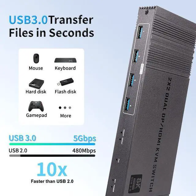 8K HDMI DP USB 3.0 KVM Switch allows you to share one USB keyboard, USB mouse, and one HDMI monitor & one DP Monitor to control 2 computers, laptops, game consoles with extended mode and mirror mode.