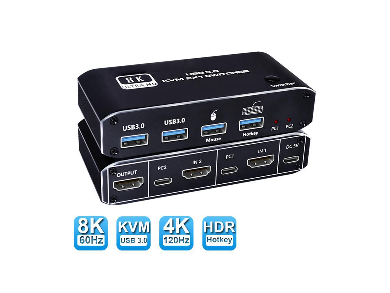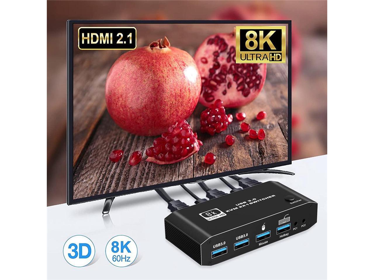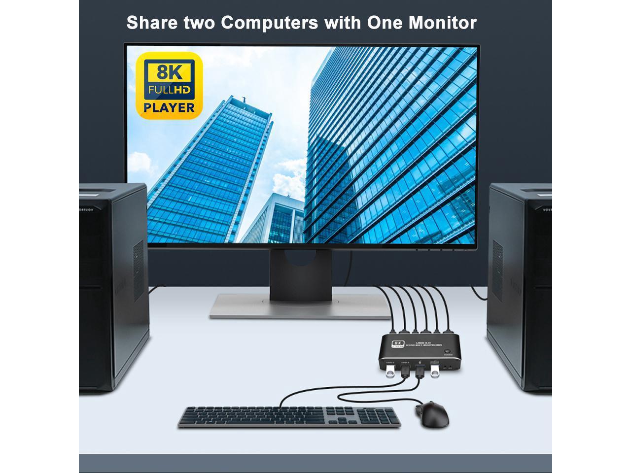 HDMI 2.1 KVM USB switch: KVM Switch allows control 2 computer with one set of controls (keyboard and mouse) and display screen. Realizes 2 in and 1 out free selection synchronous switching. You can centrally control and manage hosts laptop or game console without having to move from one workstation to another.