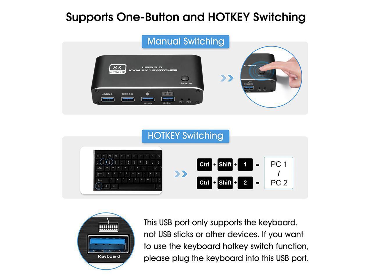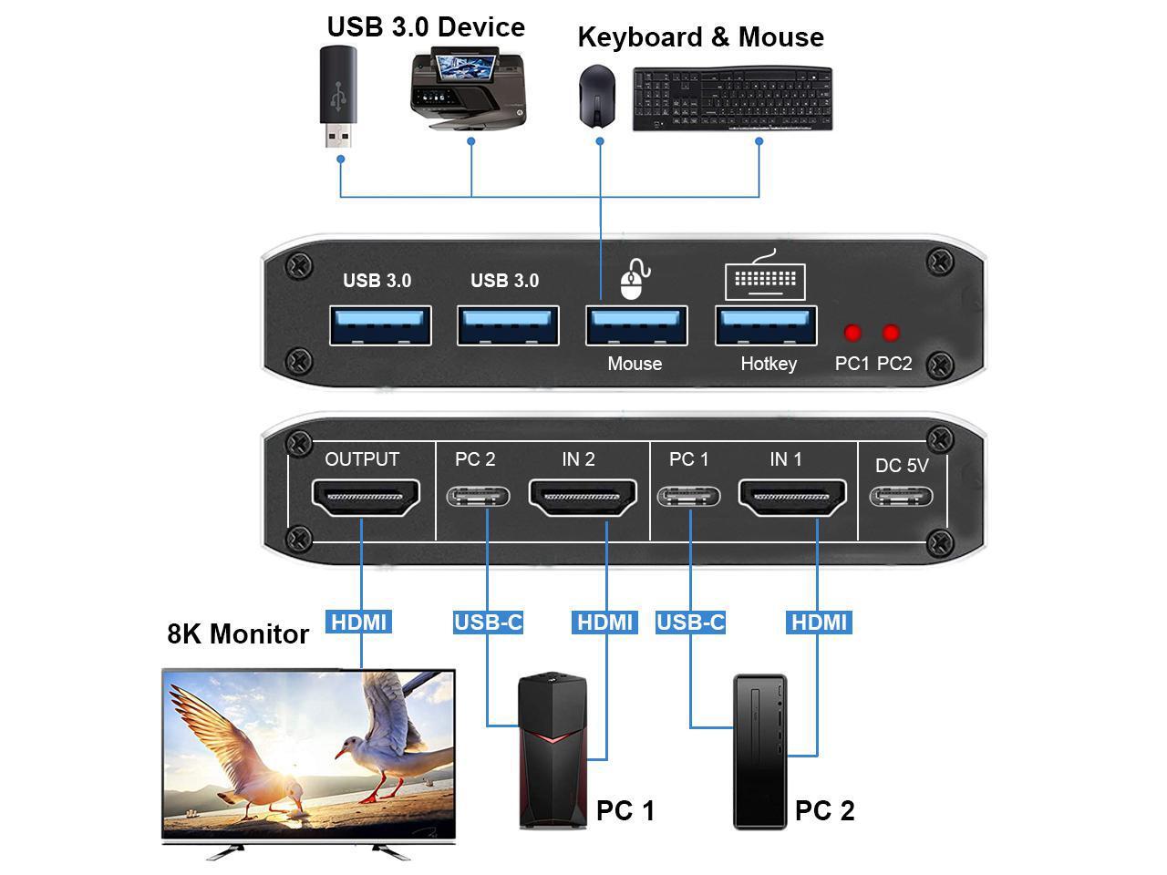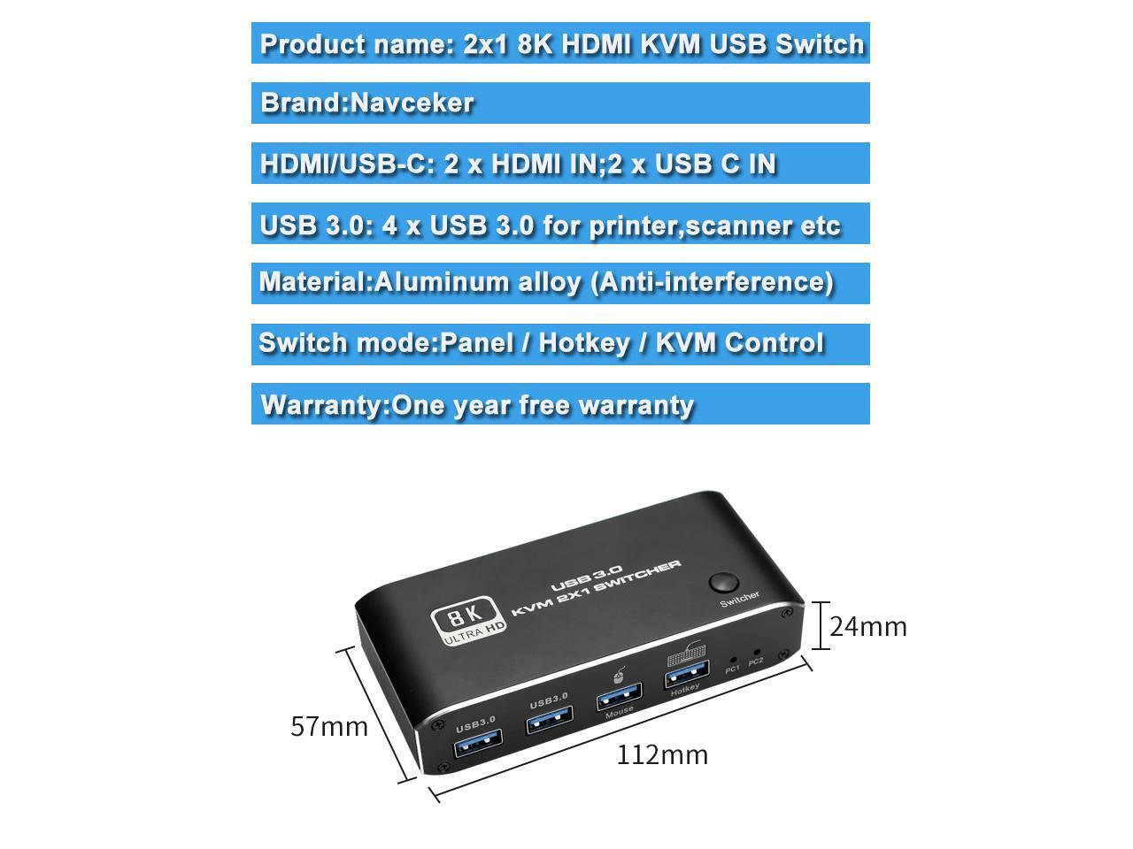 HDMI 2.1 KVM USB switch: KVM Switch allows control 2 computer with one set of controls (keyboard and mouse) and display screen. Realizes 2 in and 1 out free selection synchronous switching. You can centrally control and manage hosts laptop or game console without having to move from one workstation to another.