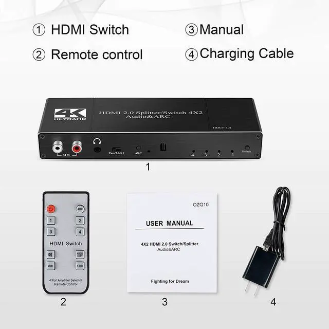 HDMI Switch 4x2: The 4x2 HDMI 2.0 switch splitter can connect 4 hdmi input signal sources to 2 hdmi output display terminals. It can easily Switch the 4 HDMI input signals to 2 HDMI output siganl. (Please