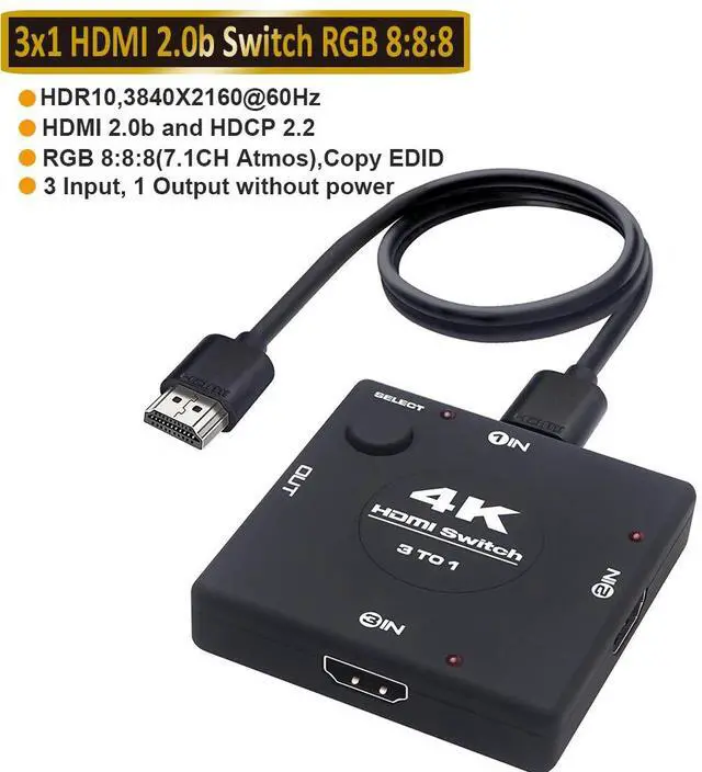 HDMI Switch is a 3 port HDMI 2.0b 4K HDMI switcher for your latest gaming and home theatre setup. It supports 3 HDMI inputs and 1 HDMI output, allowing for HDMI 2.0 and HDCP 2.2, along with 4K Ultra HD and compatibility on all HDMI.
