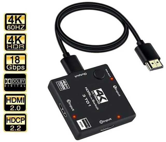 HDMI Switch is a 3 port HDMI 2.0b 4K HDMI switcher for your latest gaming and home theatre setup. It supports 3 HDMI inputs and 1 HDMI output, allowing for HDMI 2.0 and HDCP 2.2, along with 4K Ultra HD and compatibility on all HDMI.