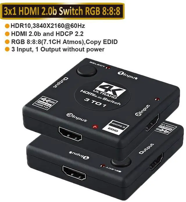 HDMI Switch is a 3 port HDMI 2.0b 4K HDMI switcher for your latest gaming and home theatre setup. It supports 3 HDMI inputs and 1 HDMI output, allowing for HDMI 2.0 and HDCP 2.2, along with 4K Ultra HD and compatibility on all HDMI.