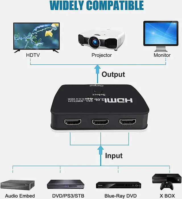 3 IN 1 OUT HDMI SWITCH: 3 HDMI ports in and 1 HDMI out for various HDMI devices, HDMI switcher 3 ports can work with most devices with standard HDMI interface. Input: PC, Laptops, Xbox 360, PS3/PS4/PS5, Roku Express, Amazon Fire TV Stick, Blu-ray DVD, etc; Output: Full HD TVs, projectors, monitors and more. (NOTE: THIS IS ONE HDMI SWITCH, NOT HDMI SPLITTER)  Crystal-clear 4K 60hz resolution